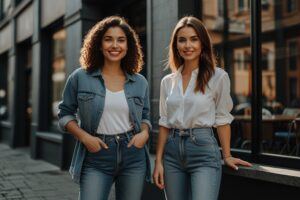 For a casual look, pair your high waisted jeans with a tucked-in graphic tee and some sneakers. It’s an effortless combo that never goes out of style. Add a denim jacket for an extra layer, especially if you’re heading out on cooler days.