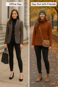 Let’s talk tops. Oversized sweaters are the quintessential fall pairing for leggings. They offer comfort and warmth while effortlessly draping over your favorite pair, creating a cozy yet polished look. Long cardigans are another fan-favorite, adding elegance that transitions well from day to night. Tunics, with their longer length, are always a smart choice if you’re seeking a little more coverage while still keeping things chic.